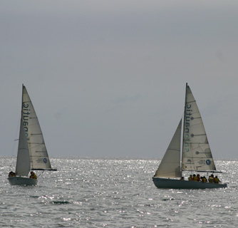 Dentro de cada una de las embarcaciones van tres-cuatro niños/as con terapeutas del centro Escala Iris y monitores de vela.